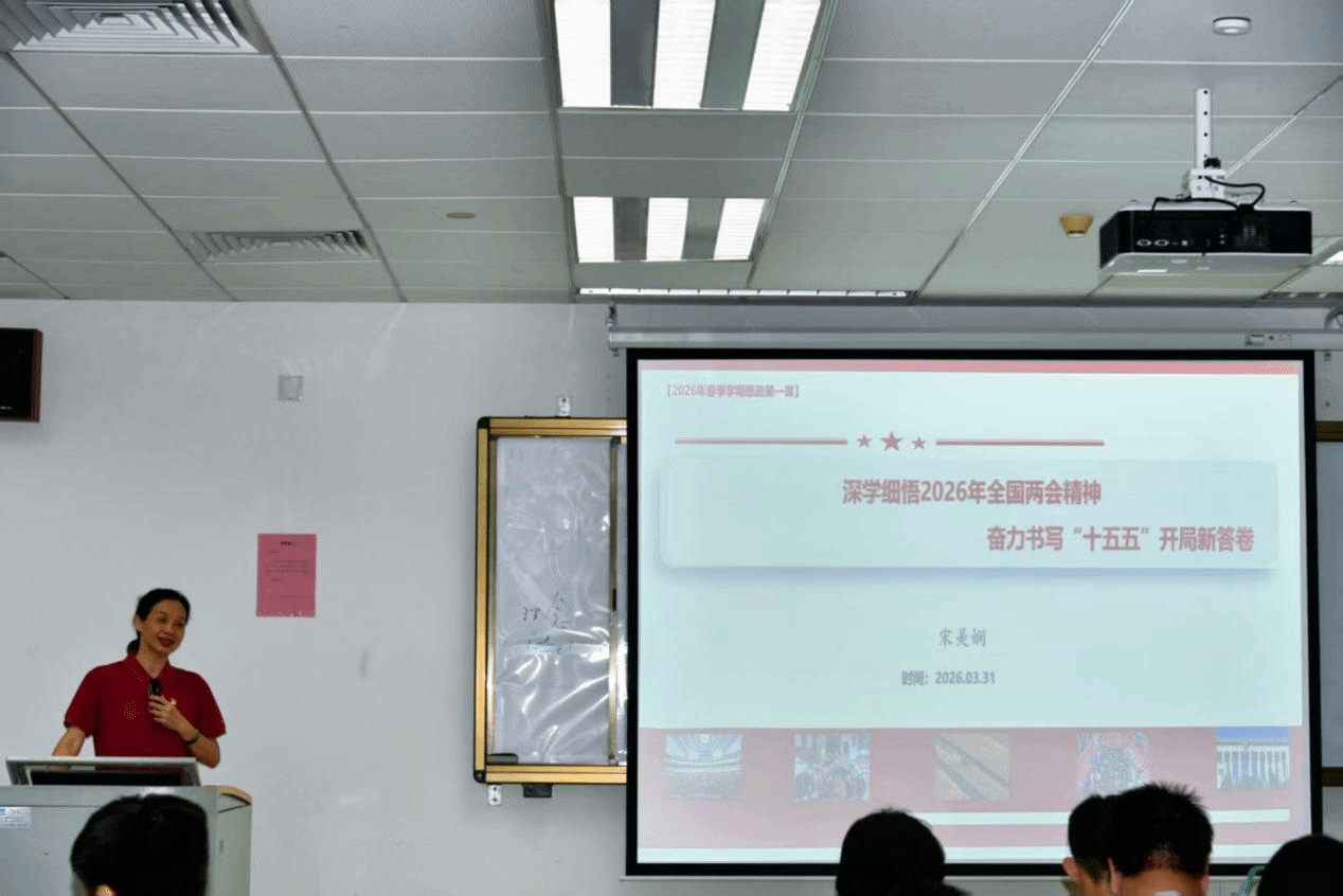 课堂上,宋美娴紧扣2026年全国两会精神与“十五五”开局要求,从全景解读、核心提炼、实践落实三个维度深入解读两会的时代意义、政府工作报告核心要点以及实践落地路径。她结合两会期间的关键提法、焦点话题,用通俗的语言、鲜活的案例,帮助同学们精准理解国家发展的新思路、新部署、新要求,切实增强青年学生的国家认同感和时代责任感。